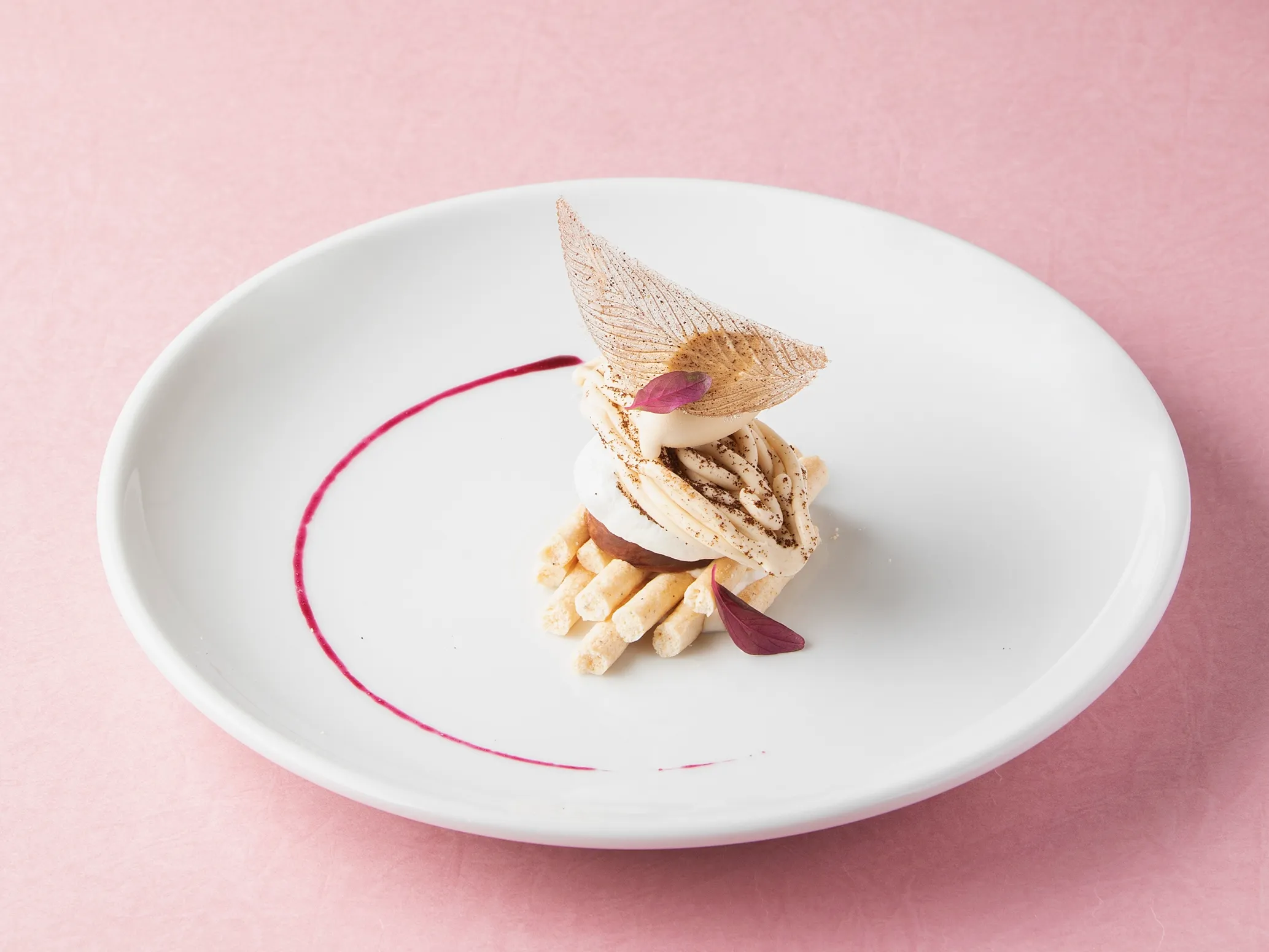 田村の作品は、ラム酒と黒糖を使ったグラスと、燻製した栗のグラスを使用したモンブランです。飴細工やグラスでつくった「葉」や、弧を描く山葡萄のソースで「風」をイメージするなど、ひと皿で秋風に舞う葉をデザインし、静かに訪れる秋を表現しています(タイトル「 Visite d’automne 秋の訪れ」)。