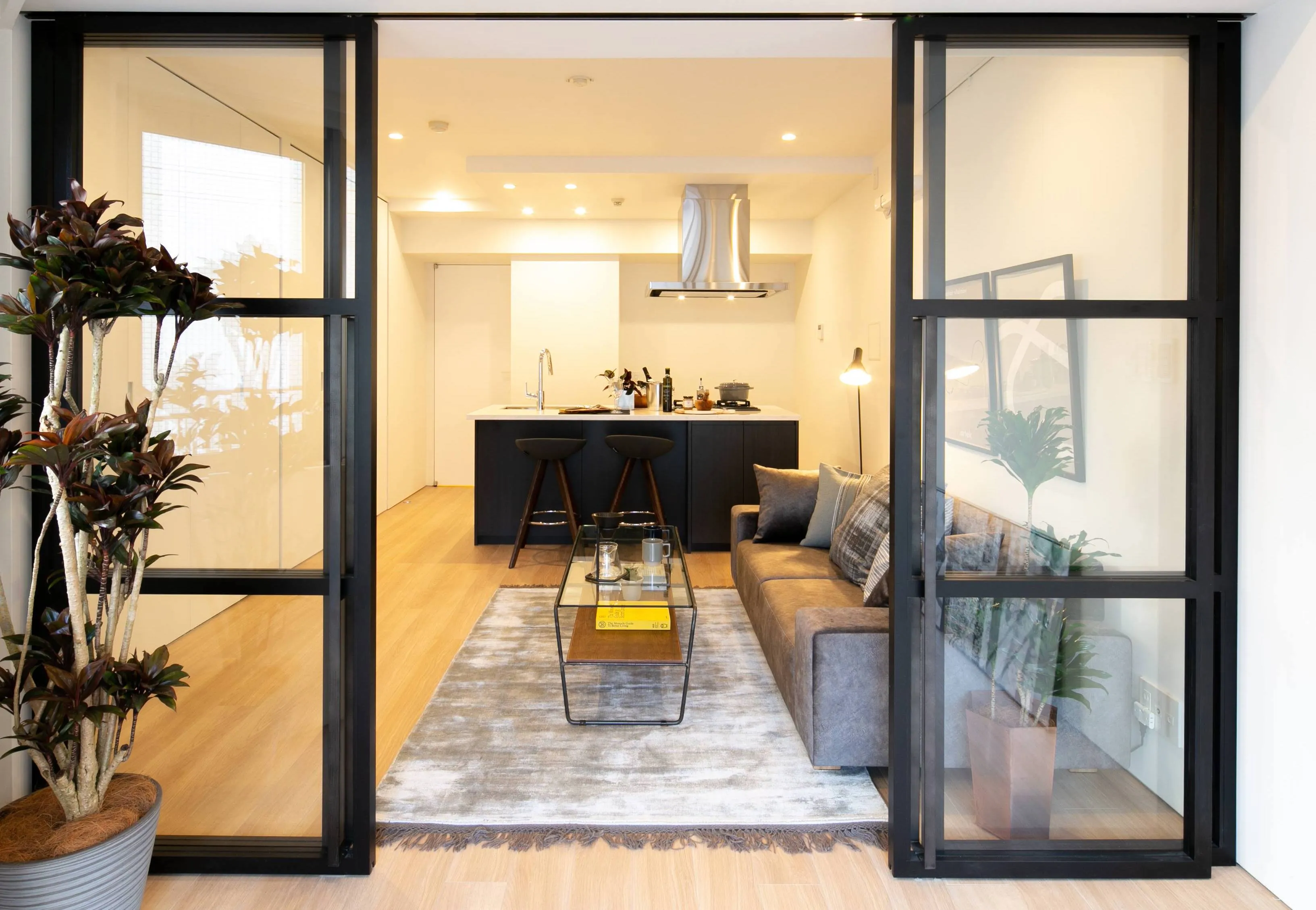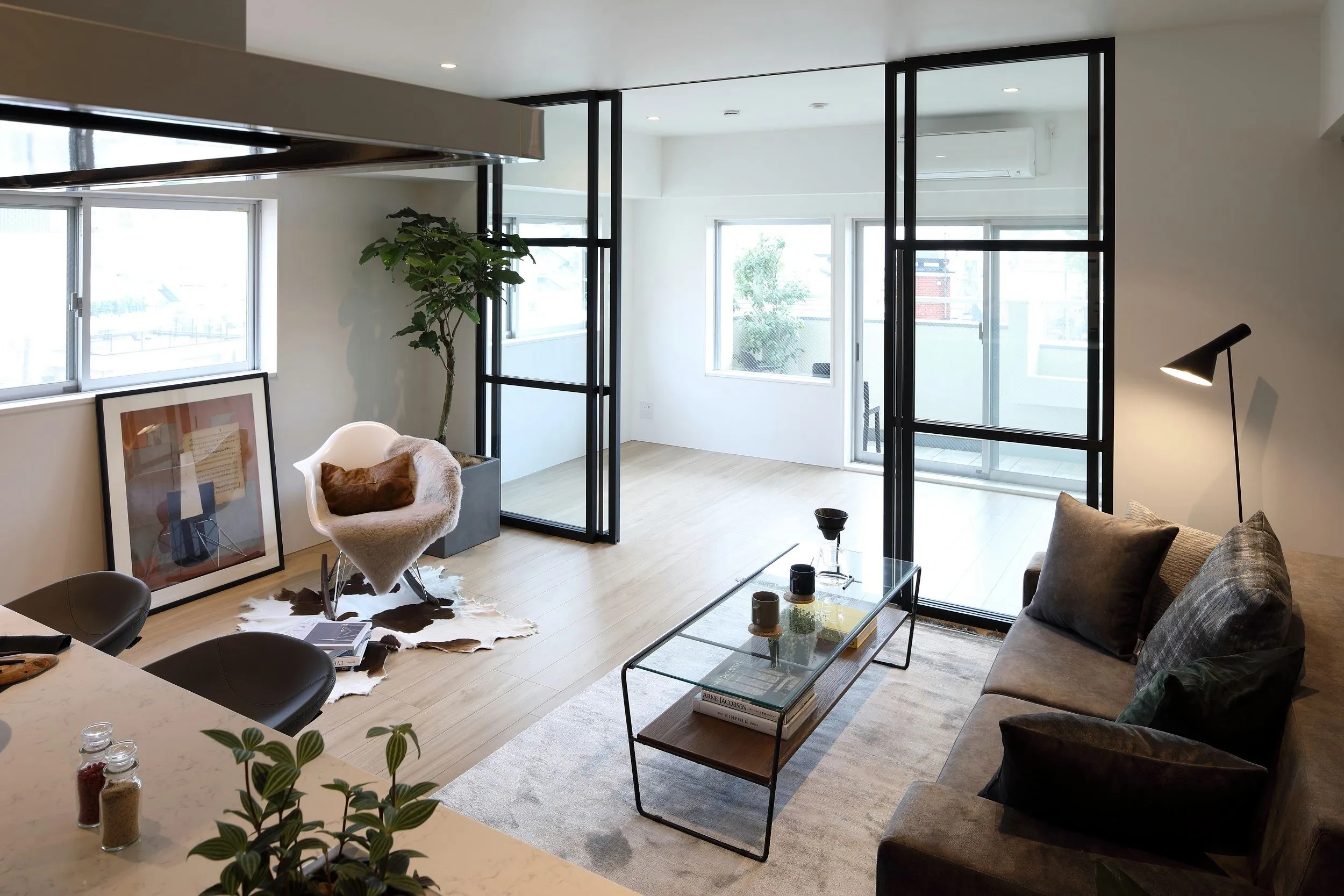 ・ガラスを使用したオリジナルの建具はゆったりとしたひとつの統一空間を演出するとともに、洗練された印象を作り出します。