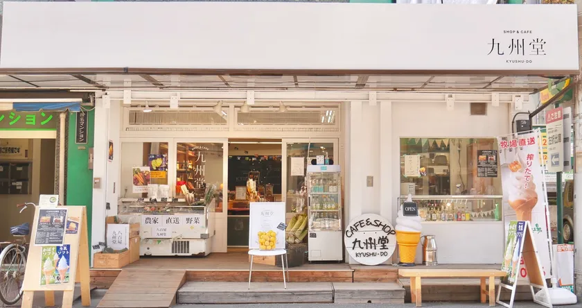 カフェでは、九州から産地直送で届いた旬の食材を使ったメニューが楽しめます。甘みたっぷりの「石焼き芋モンブランパフェ」「焼き芋」や「風の牧場ソフトクリーム」「玄米珈琲」「赤しそジュース」「九州地サイダー」など、九州ならではのカフェメニューを用意しています。