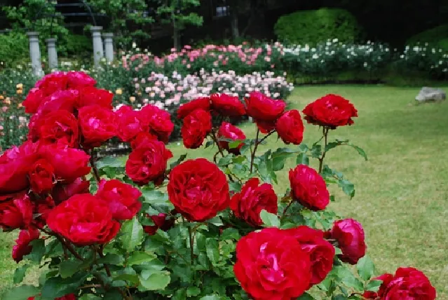 山の丘陵を利用した園地に広がるバラの小径「ローズウオーク」。一般的なフォーマルガーデンとは違い、周囲の景観にとけこむ様にバラを植栽し、自然との調和を大切にした珍しい散策型デザインのローズガーデンです。色とりどりのバラが楽しめ、気取らずに 気軽にバラと親しんでもらうことをコンセプトとしています。