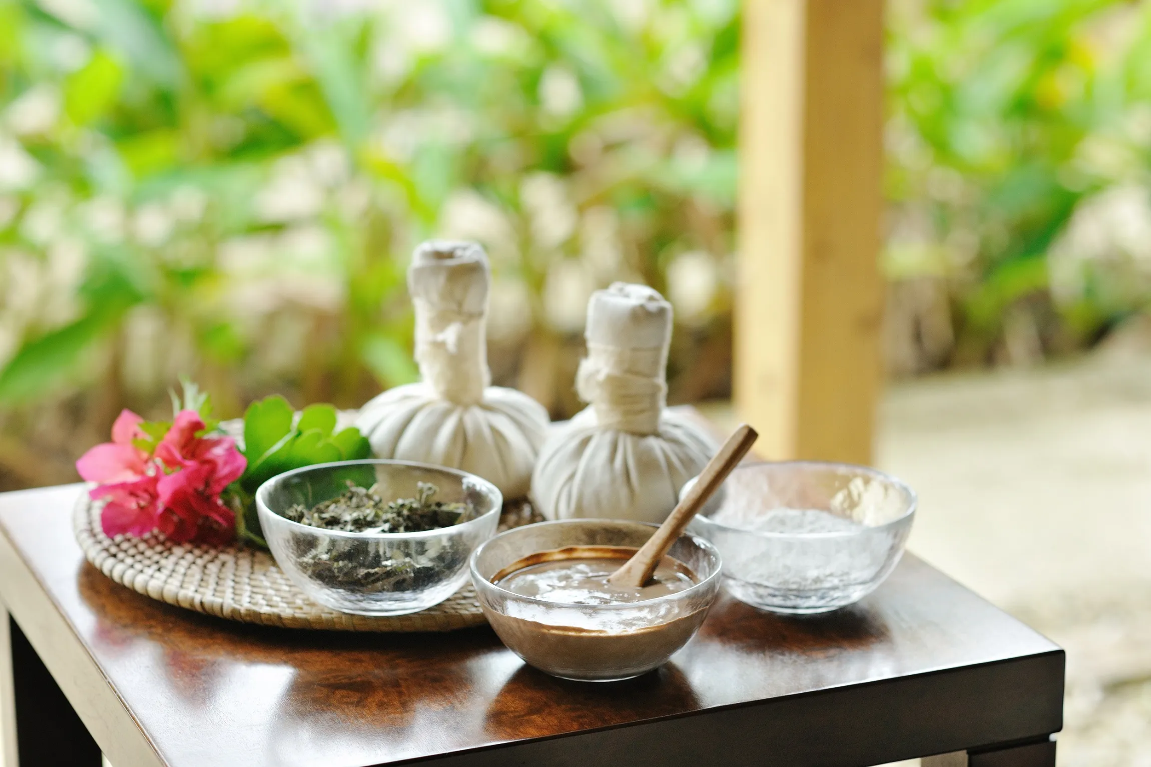 1日目の午後は、泡盛のもろみ、長命草、よもぎ、もち米などを混ぜ合わせ、蒸しあげて作った「泡盛もろみ玉」を使用したスパトリートメントを受けます。ハーブの心地よい香りと、もろみ玉のふんわりとして温かい肌触りで、まどろむほどリラックスできます。