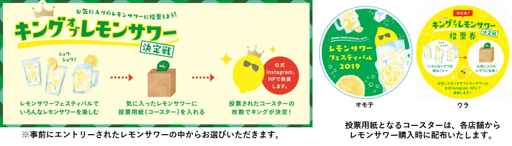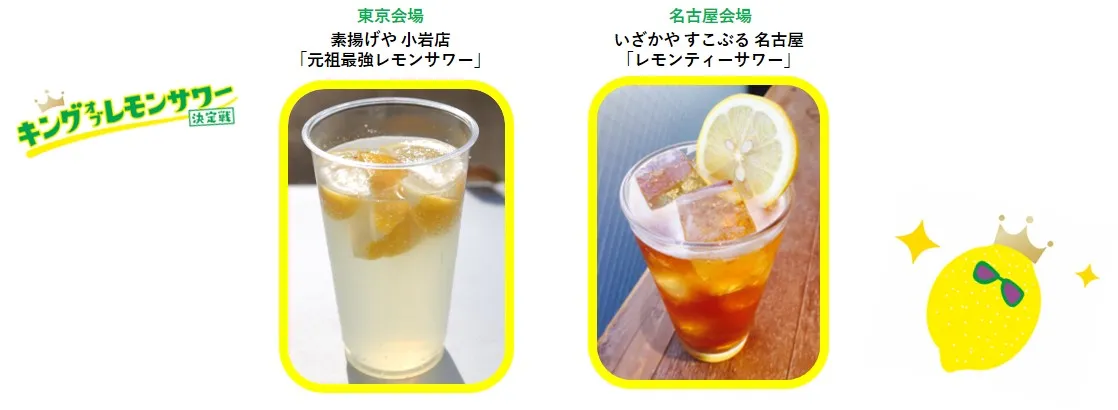ご来場いただいたお客さまの投票で、各会場で1番人気のレモンサワーを決定いたします。各店工夫を凝らしたこだわりのレモンサワーが集結する中、大阪会場のキングの座を手にするのは、どのレモンサワーか!? 皆さまの投票をお待ちしております。