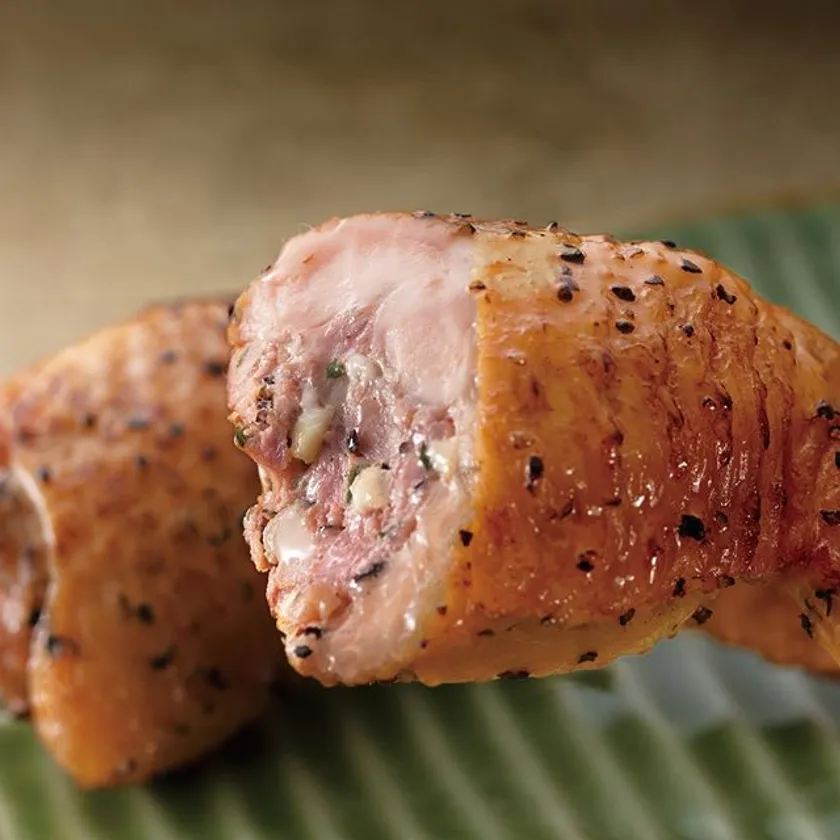 手羽ポケットンは、手羽先の骨を抜き、調味液に漬け込み熟成。そこにソーセージの生地を充填しスモークした、ジューシーな手羽のハムとソーセージが一度に楽しめる贅沢なソーセージです。