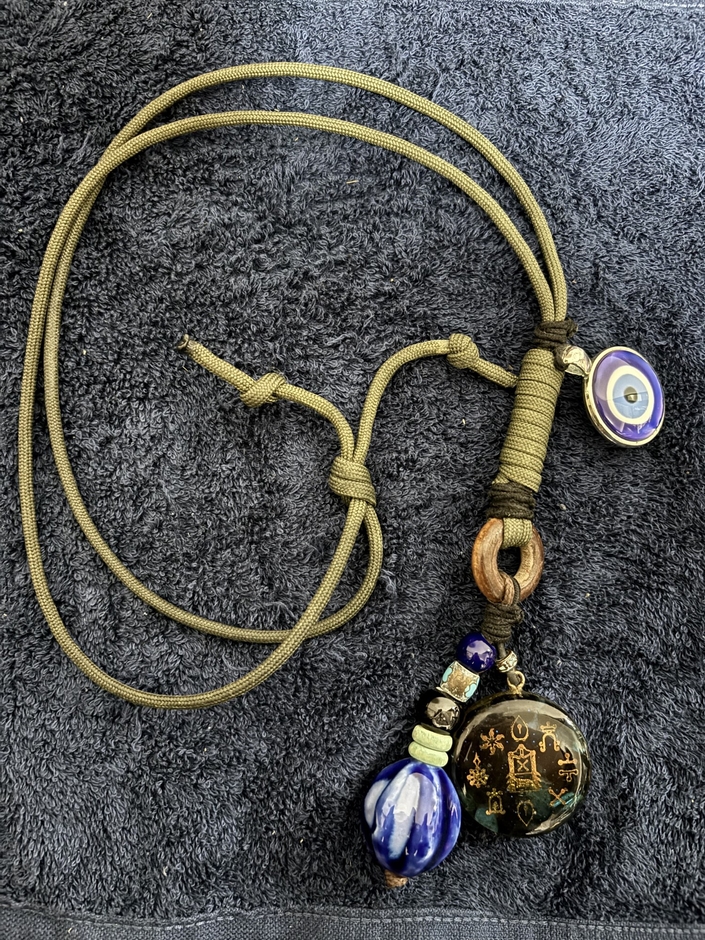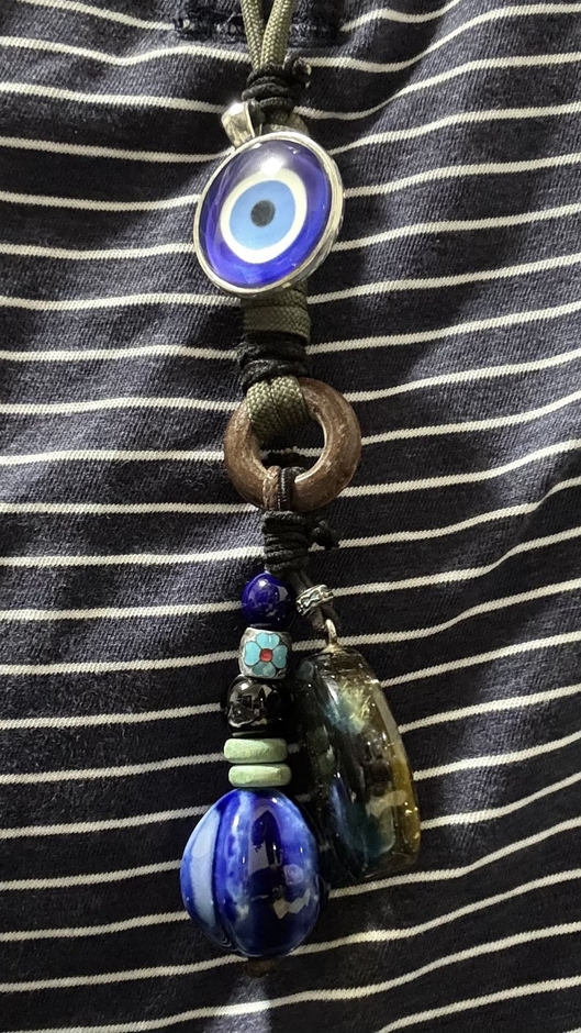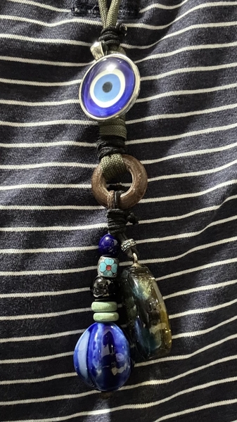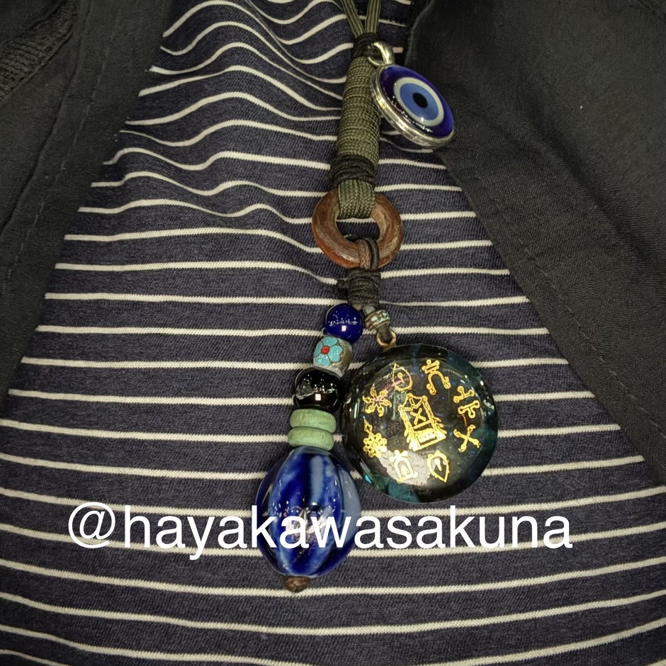 ボヘミアン・エスニック陶器、トルコのナザールボンジュウ(邪視・邪眼…Evil Eye除けの御守り)、日本の十種神宝(とくさのかんだから)・裏面はヤタノカカミの御守りの三種セットのペンダントになります。