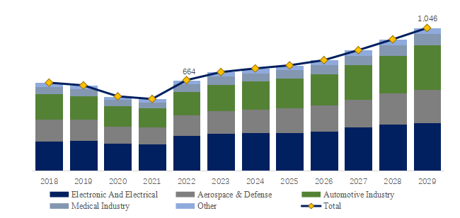 製品用途では、電子・電気が最大の用途で、2022年には39%のシェアを占める。
