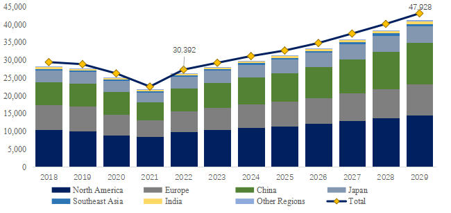 消費に関しては、北米が32.5%の市場シェアを持つ最大の消費者市場であり、次いで中国が21%、ヨーロッパが19%である。2023年から2029年にかけての年平均成長率は約9%で、中国が最も急成長すると予想される。