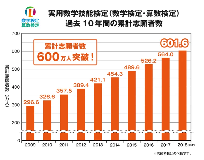 公益財団法人日本数学検定協会(所在地:東京都台東区、理事長:清水 静海)が実施している「実用数学技能検定(数学検定・算数検定)」において、1992年に実施した第1回の検定から2019年3月に実施した検定までの累計のべ志願者数が600万人を突破しました。実用数学技能検定(数学検定・算数検定)は、昨年(2018年度)に検定制度の創設から30周年を迎えており、大きな節目に大台に到達したことになります。