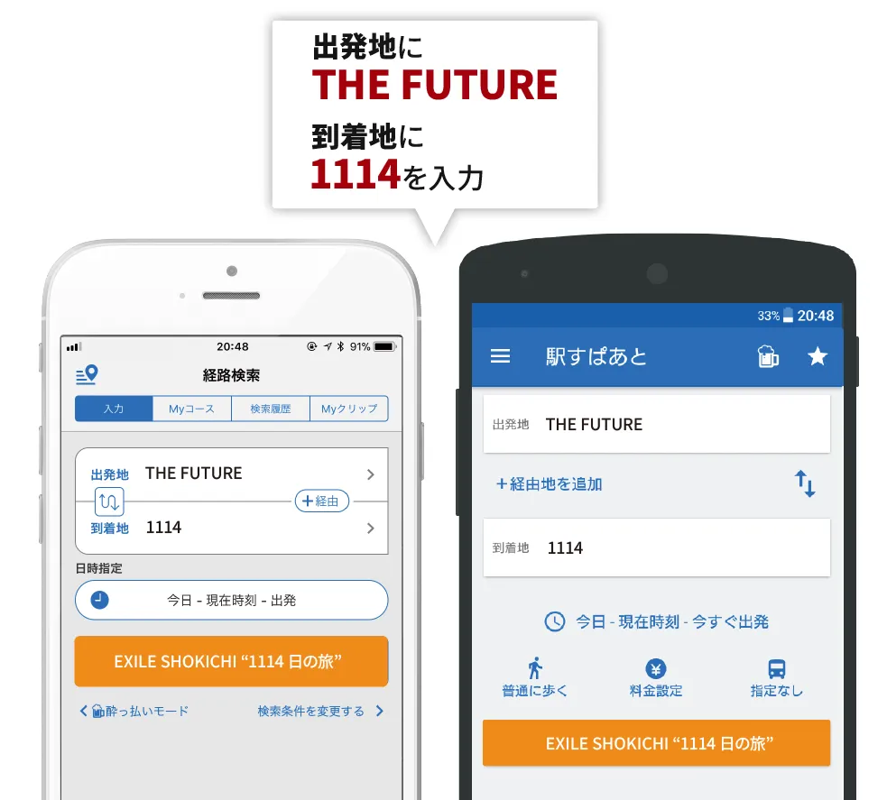 iPhone/Androidアプリ「駅すぱあと」の経路検索機能で、出発地に「THE FUTURE」、到着地に「1114」を入力すると、通常の「検索」ボタンが「EXILE SHOKICHI “1114日の旅”」ボタンに変わり、スペシャルムービーが表示されます。