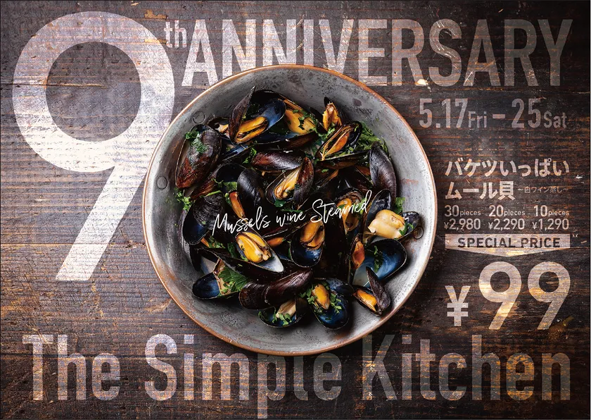 看板メニュー『バケツいっぱいのムール貝』を全サイズ99円で提供 シンプルキッチン南青山の9周年フェアを5/17~開催