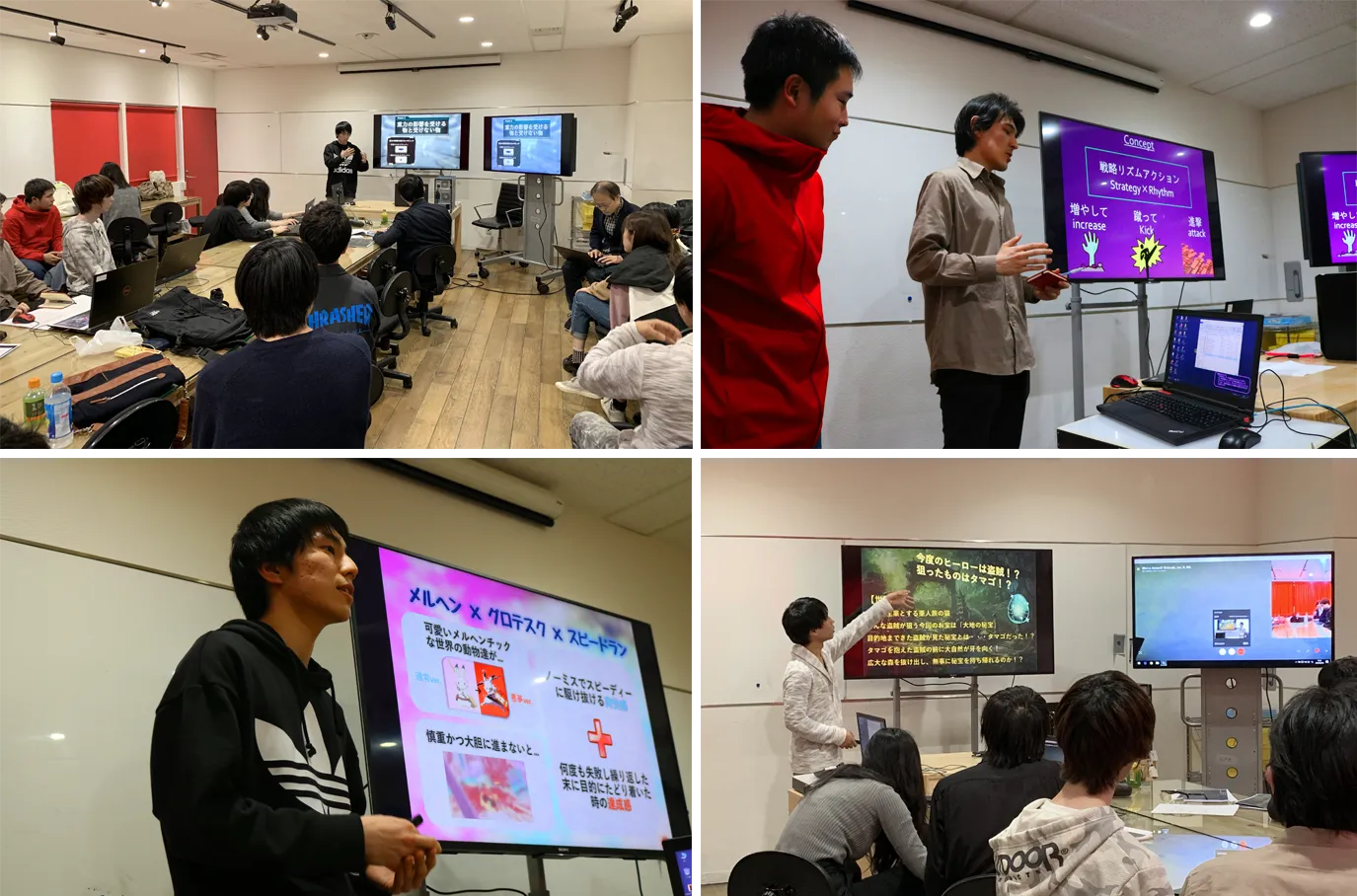 日伊学生が共同で開発するゲーム企画を選定するため、審査会を4月16日に開催。審査会では日伊それぞれの学生が発案した全16企画を、通訳を介して学生自ら須田氏へプレゼンテーションを行いました。企画書にはゲームのコンセプト、プレイ方法やキャラクターイメージなどゲームの世界観が盛り込まれ、企画書のデザインをはじめ、プレゼンテーションにも日本側とイタリア側で様々な特徴が見られました。
