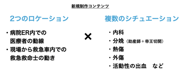 本プロジェクトでは、救急車両内でのプレホスピタルコンテンツと、病院内でのインホスピタルコンテンツを開発します。コンテンツは、学生へのランダマイズ検証や理解度テストなど、教育効果の比較検証を重ね、リモート環境でも従前の実習カリキュラムと同レベル以上の学習効果をもたらすプログラムの開発を目指します。