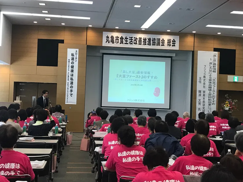 フジッコ株式会社(本社:兵庫県神戸市中央区、代表取締役社長:福井 正一)は、香川県丸亀市を中心に「私たちの健康は私たちの手」をスローガンに食生活改善推進活動を行っている丸亀市食生活改善推進協議会が2019年5月10日(金)に丸亀市ひまわりセンターにて開催した総会で、「蒸し大豆の食後血糖値上昇抑制効果」に関する講演を実施いたしました。