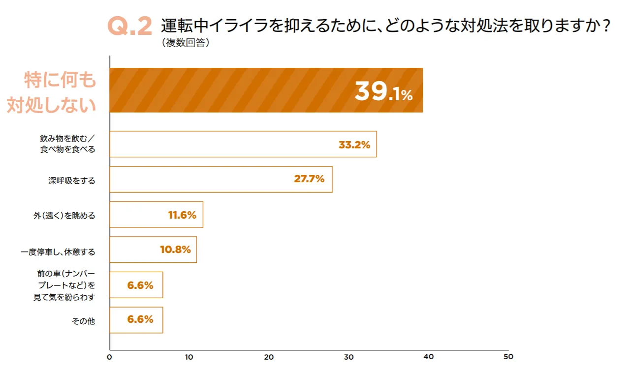 そこで、その運転中のイライラをおさえるためにどのような対処法をとるのか尋ねてみたところ、「特に何もとらない」と回答した人が39.1%いる結果となりました。この結果から9割もの人が運転中イライラしているにも関わらず、運転中にイライラした際それをおさえるための行動を何もしない人が約4割もいるという危険な事実が判明しました。