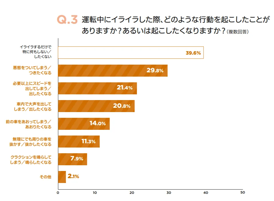 また、運転中にイライラした際、「イライラするだけで特に何もしない/したくならない」と回答したのはわずか39.6%で、「必要以上にスピードを出してしまう、または出したくなる」、「前の車をあおってしまう、またはあおりたくなる」など、60%以上の人がロードレイジを犯してしまう可能性があるという結果が出ました。このことから、多くのドライバーは運転中にイライラすることがあり、そのイライラが原因で、あおり運転などの危険運転が横行していると考えられます。