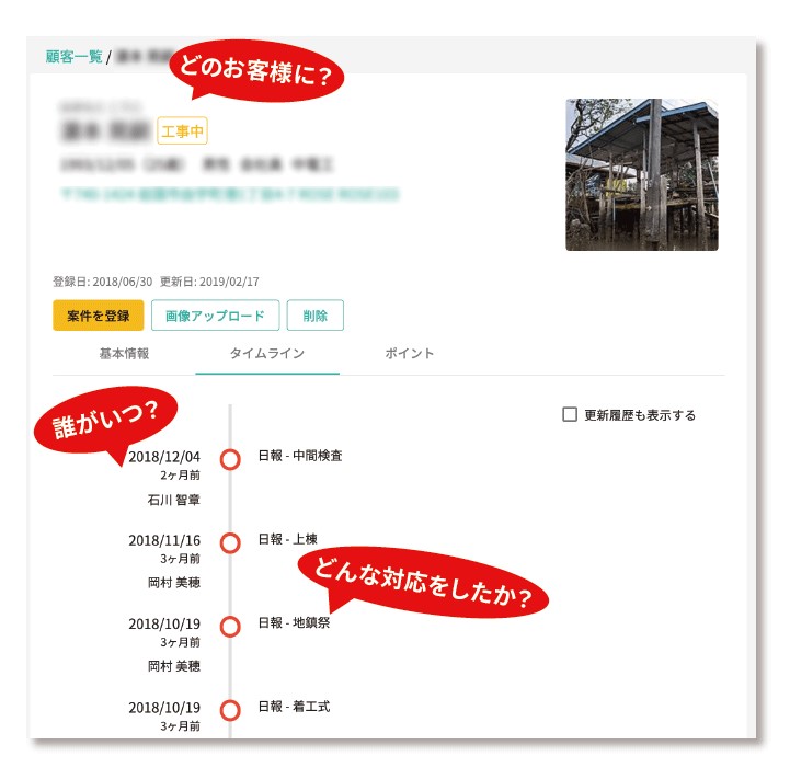 2 顧客情報の更新履歴をタイムライン表示にすることで顧客ごとに「従業員の誰がいつどのような対応をしたか」を分かりやすく表示