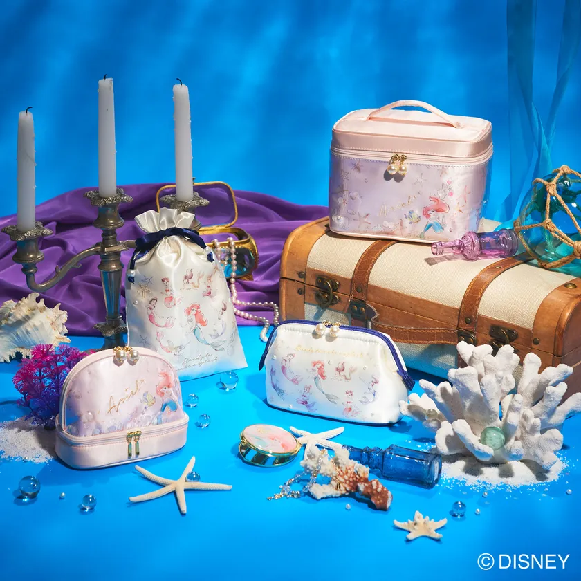『リトル・マーメイド』のアイテムを展開するのはコクーニストとしては初めて。水彩画の優しいタッチで描かれた「アリエル7姉妹」のコクーニストオリジナルアートを使用。他では見かけることが少ない、「アリエル7姉妹」を描いた美しいマーメイドコレクションです。ポーチはサテン地にパールをあしらい、大人っぽい世界観を表現しました。夏のトラベルに最適なバニティや巾着をはじめ、ドレッサー周りで活躍するコスメバスケットなどもラインナップします。