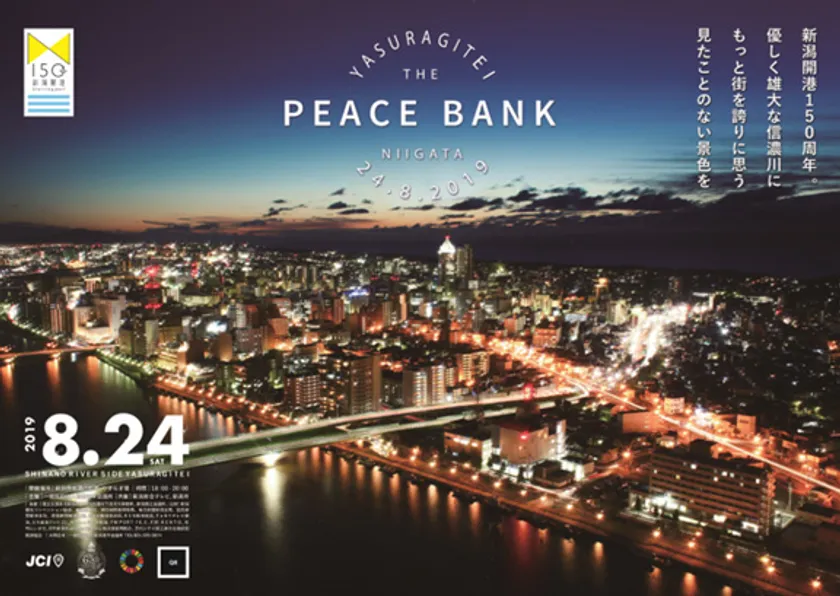 (一社)新潟青年会議所(所在地:新潟県新潟市 理事長 五十嵐悠介)は新潟開港150周年を祝し、2019年8月24(土曜日)17:00から、信濃川下流域(新潟市万代やすらぎ提)にて、川の上にステージを設置し、植物アーティスト「TOMIZOU」氏を迎え、光をテーマに装飾を施し、アーティストの「BENI」と「尾崎裕哉」を迎えたライブイベント「PEACE BANK」を1000名限定で開催致します。また、同日、多くの市民に SDGs((持続可能な開発目標))の取り組みを認知してもらうための活動、PRも行います。※16:00より同会場にて鑑賞エリア内事前チケットを配布致します。(1000名限定)