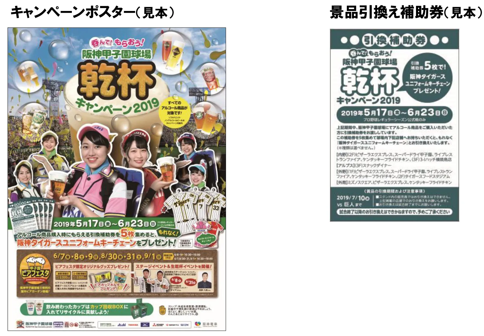開催期間中、阪神甲子園球場でアルコール商品(※)をお買上げの方に「景品引換え補助券」をもれなく差し上げます。5枚集めた方に景品を一つプレゼントします。