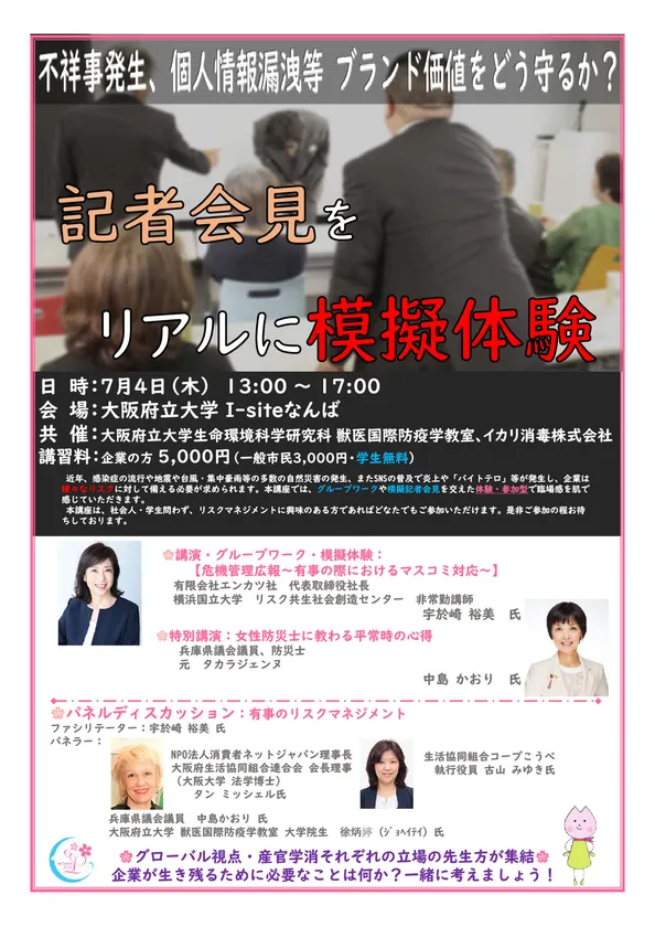 女性の輝く社会を応援するイカリ消毒株式会社(所在地:東京都渋谷区、代表取締役社長:黒澤敬)は、大阪府立大学 生命環境科学研究科 獣医国際防疫学教室と共催で、2019年7月4日(木)に大阪府立大学 I-siteなんばにおいて、「記者会見をリアルに模擬体験ー不祥事発生、個人情報漏洩など、ブランド価値をどう守るか-」を開催します。