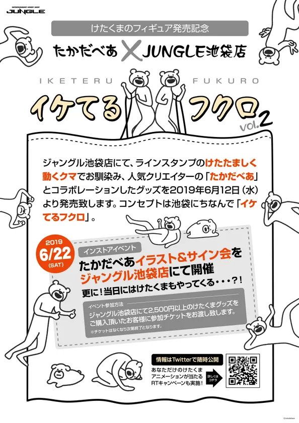 また、「けたくまのフィギュア(販売元:ソニマート)」の発売を記念して、ジャングル池袋店にてたかだべあインストアイベント「イケてるフクロ vol.2」を2019年6月22日(土)に開催予定です。