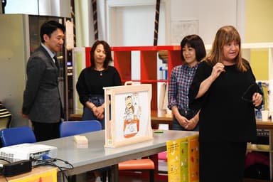 今回はそのランボルギーニ・イオタ生誕50周年に合わせて世界各地で作られた“クローンイオタ”(オリジナルの実車は存在しない)やファンが集結する中で、絵本「アヒルのジェイ」及び、現在製作中であるイオタのアルミオブジェ(フロント部分)のワールドプレミアを行いました。また2日後の4月29日には、サンタアガタの小学校、幼稚園の生徒たちに、授業の一環として絵本「アヒルのジェイ」を紹介し、このアルミオブジェを披露しました。