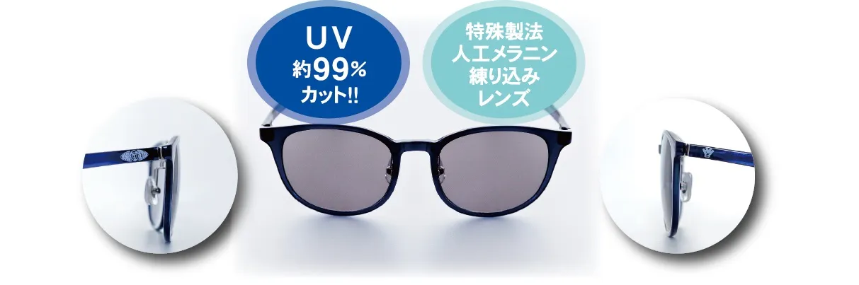 “目から肌を考えるメラニンレンズ”を使用。UV99%カット・特殊製法人工メラニン練り込みレンズ
