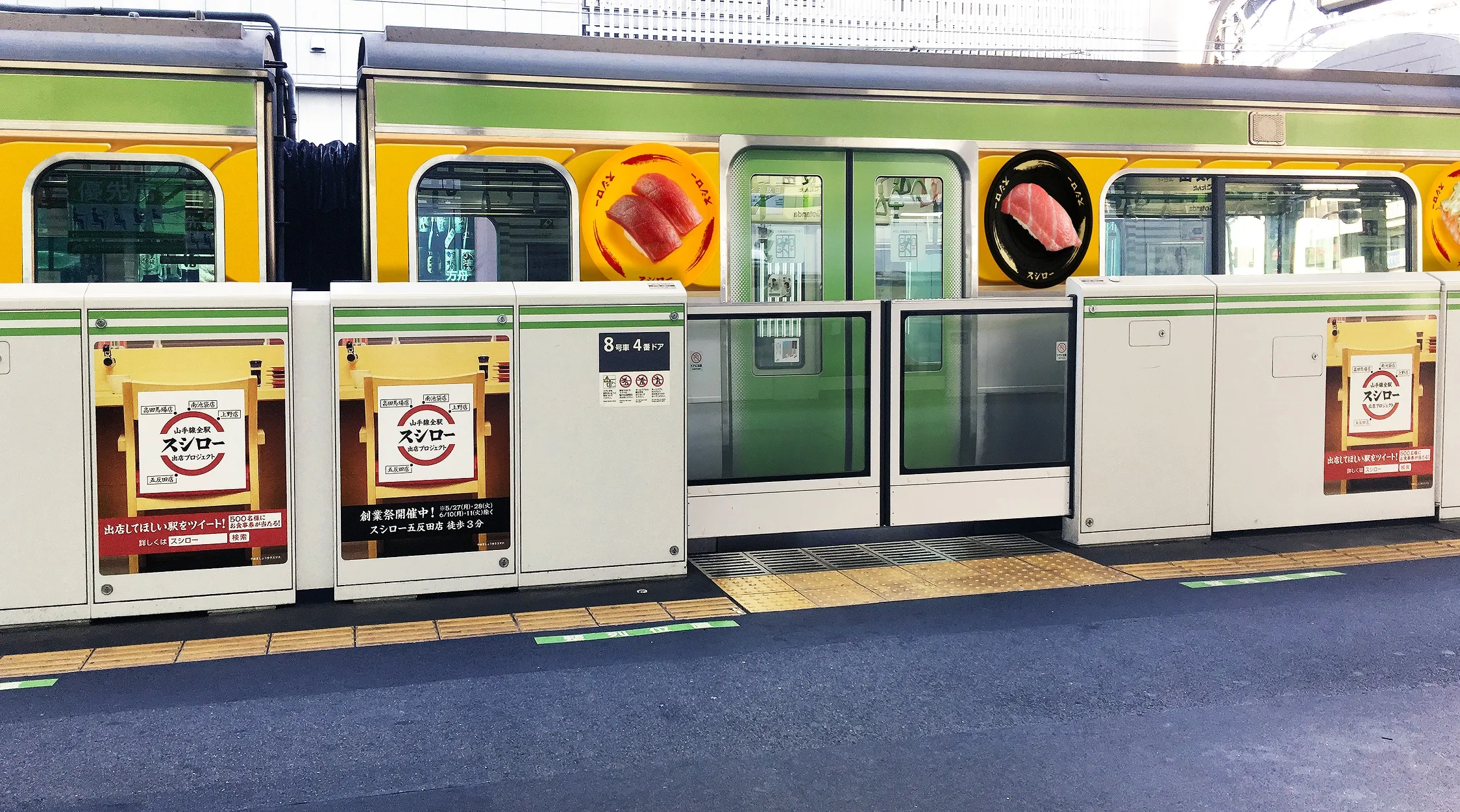 JR山手線がまるごと巨大回転すしに!? 本日より、一部を除く山手線内ホームドア設置駅のホームドアが スシローカウンター席に大変身! さらに5月19日(日)からは全面おすしラッピングを施した 「スシロートレイン」も登場!!