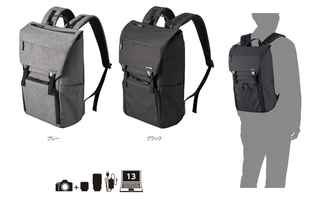 一覧性の高いフロントアクセス構造のカメラ収納部と、フラップトップの上部収納部からなる2気室のバックパックタイプのカメラバッグです。