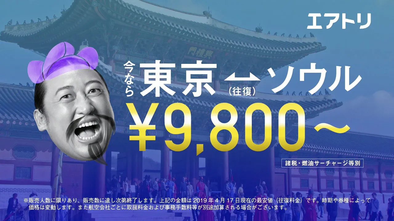 夏の旅行に向けて国内・海外のお得な航空券やツアーを販売する「超サマーセール」※1を紹介し、東京-ソウル往復航空券9,800円~、東京-沖縄ツアー3日間15,800円などの目玉商品を訴求する内容となっています。