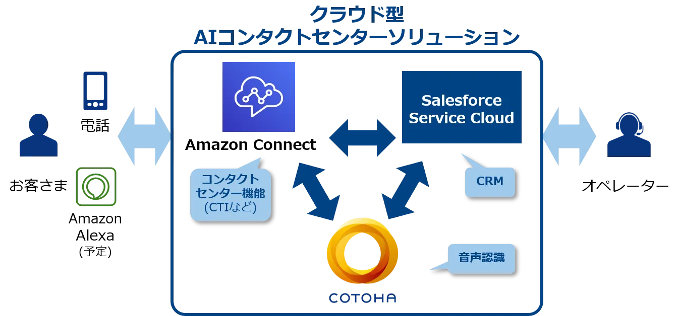本ソリューションは、NTT Comの自然言語解析AI「COTOHA(R)」(※2)シリーズと、アマゾン ウェブ サービス(以下 AWS)が提供するコンタクトセンターサービス「Amazon Connect」(※3)、およびセールスフォース・ドットコムの提供するCRMサービスプラットフォーム「Salesforce Service Cloud」を活用したもので、AIによる音声認識などを利用した高機能のコンタクトセンターを短期間で構築することができます。