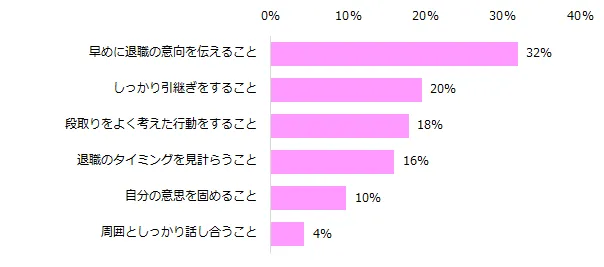 第3位は「段取りをよく考えた行動をすること」(18%)が続きました。 「先に退職の噂が立ったりしないよう、退職の意思は直接の上司など一番最初に伝えるべき人に伝える。また、後任者が入社するまでの間にマニュアルを作成しておき、上司にも渡しておく」(32歳)、 「退職の時期、周囲への報告の順番、仕事の引継ぎなど考えなければならないことがたくさんある。周りの理解を得ながら、順番に行なうことで円満に退職できると思うから」(39歳)など、退職確定以降を見据えて、計画的に動く必要がありそうです。