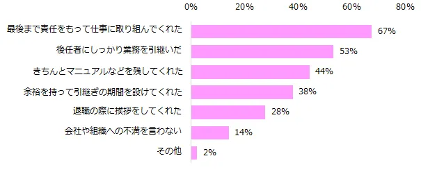 気持ちよく送り出せた退職者の特徴を伺ったところ、「最後まで責任をもって仕事に取り組んでくれた」(67%)、「後任者にしっかり業務を引継いだ」(53%)、「きちんとマニュアルなどを残してくれた」(44%)でした。