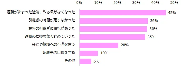 一方、困った退職者の特徴は「退職が決まった途端、やる気がなくなった」(45%)、「引継ぎの時間が足りなかった」(36%)、「業務の引継ぎに漏れがあった」(36%)でした。