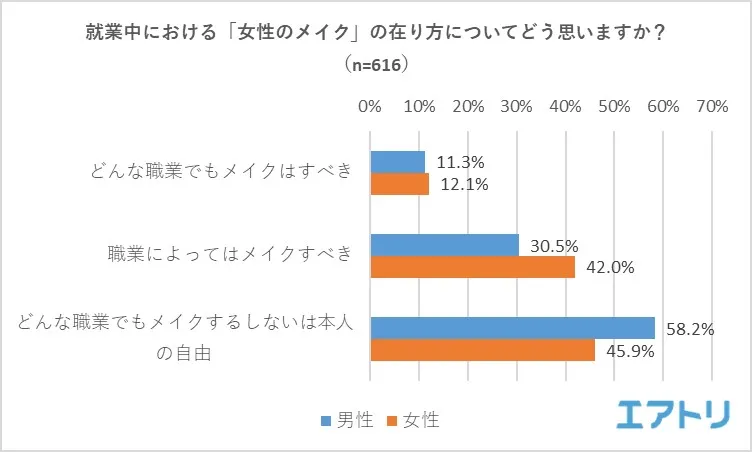 ―「どんな職業でもメイクはすべき」「職業によってはメイクすべき」と回答した割合は、男性が41.8%だったのに対し、女性は10ポイント以上上回る54.1%となりました。