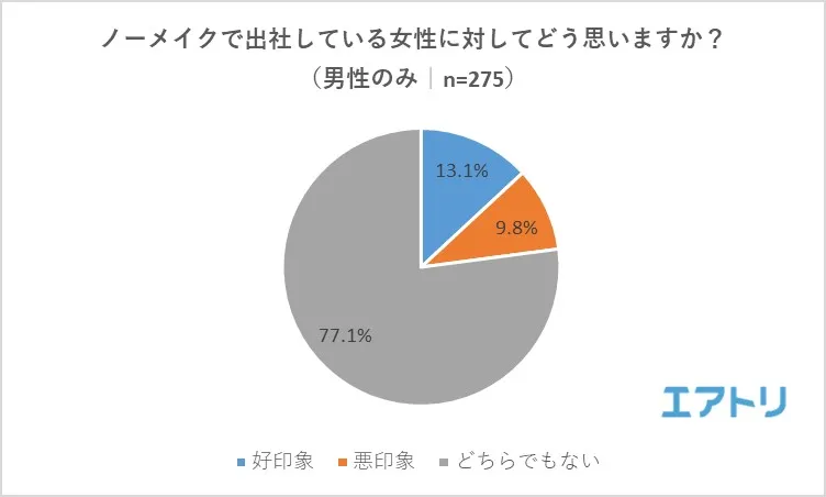 「悪印象」と回答したのは1割以下、更に13.1%の人は「好印象」と回答しました。“男性はノーメイクの女性が好き”とよく聞きますが、どうやら嘘ではなさそうです。