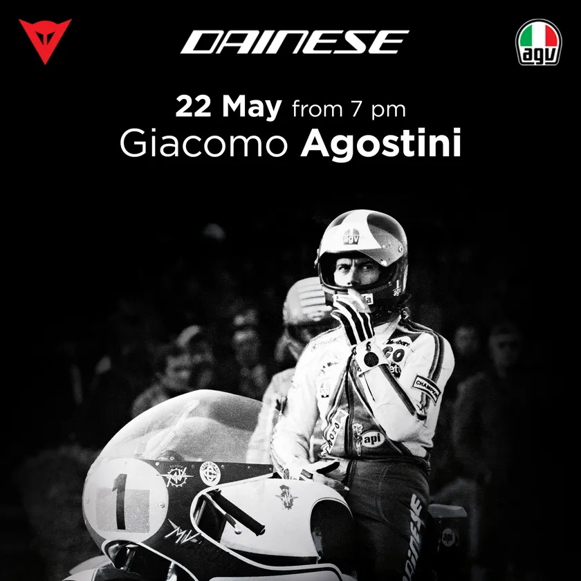 アゴスチーニ氏はダイネーゼ、AGVにとってその歴史を語るうえで欠かせないライダーであり、特にAGV社のロゴは、同氏のヘルメットからインスパイアされたものであるという事実はあまりにも有名です。