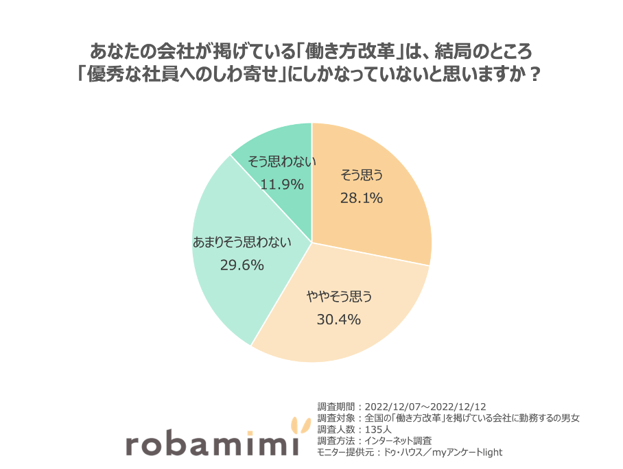 働き方改革を掲げている会社に勤務する方を対象に、「あなたの会社が掲げている「働き方改革」は、結局のところ「優秀な社員へのしわ寄せ」にしかなっていないと思いますか?」という質問をしたところ、「そう思う(28.1%」、「ややそう思う(30.4%)」、「あまりそう思わない(29.6%)」、「そう思わない(11.9%)」と回答しました。約6割が優秀な社員へのしわ寄せになっていると考えていることが分かりました。「そう思う」と回答した人からは、「仕事ができてもできなくても、一定時間勤務していれば、決まった給与はもらえる。成果を上げれば上げるだけ、自分の仕事は増える(50代女性)」、「働き方改革でDX推進をしているけれども、結局手作業でやっていたものをデジタル化して、ITが苦手な人は仕事が減って楽になったと思う。(50代女性)」といった声が寄せられました。