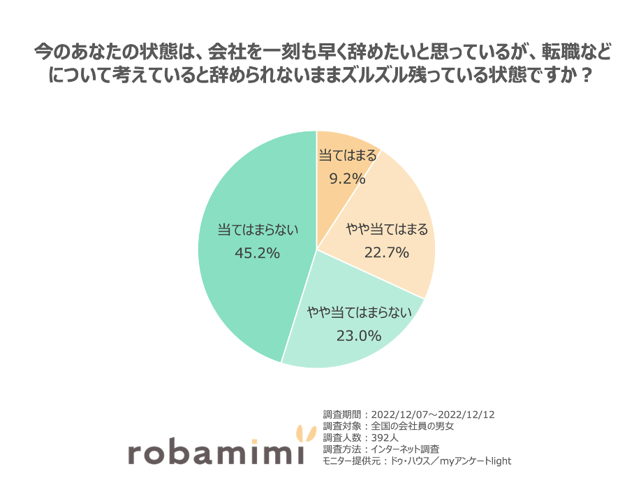 会社員を対象に、「今のあなたの状態は、会社を一刻も早く辞めたいと思っているが、転職などについて考えていると辞められないままズルズル残っている状態ですか?」と質問したところ、「当てはまる(9.2%)」、「やや当てはまる(22.7%)」、「やや当てはまらない(23.0%)」、「当てはまらない(45.2%)」という結果になりました。