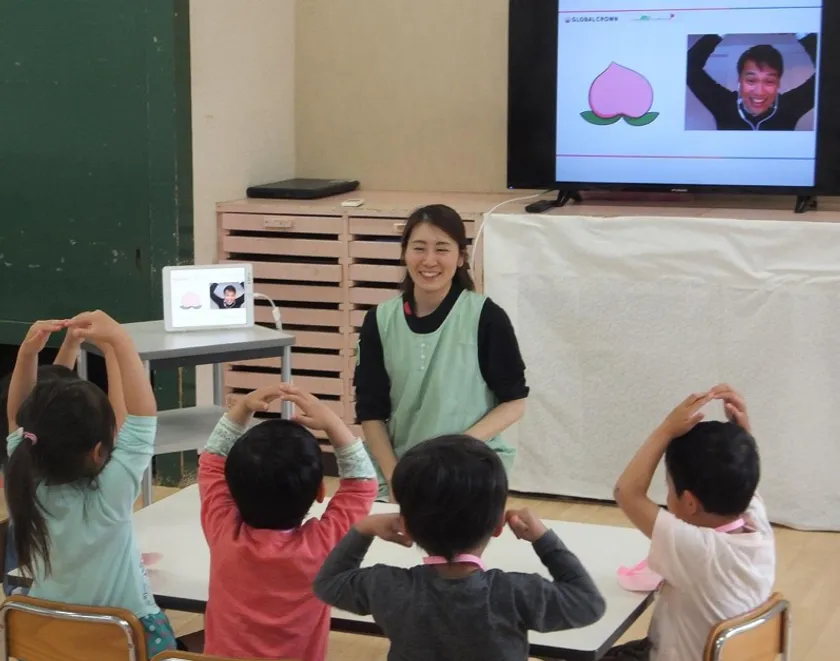 この度、その一つの取り組みとしてオンライン英会話GLOBAL CROWNを神戸教育短期大学付属八尾ソレイユ認定こども園に導入しました。レッスンは、ICTを活用しているため手軽に複数クラスの同時間帯での実施も可能です。園児は、少人数で短時間に集中して楽しみながら積極的に英会話に参加しています。英語に興味を持つとともにコミュニケーション能力の育成にも効果が期待できます。今後は、もう一つの付属園にも展開していく予定です。