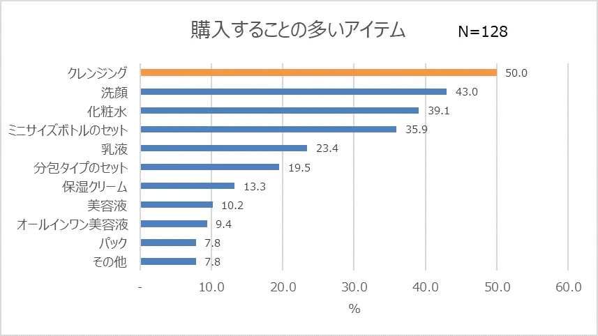 続いて、コンビニコスメの中で人気のアイテムについて調べてみると、「クレンジング」(50.0%)が最も多い結果となりました。就寝前のメイク落としは女性にとって必須なので、クレンジングは最低限揃えたいアイテムであると考えられます。その後には「洗顔」(43.0%)、「化粧水」(39.1%)と、定番のアイテムが続きました。