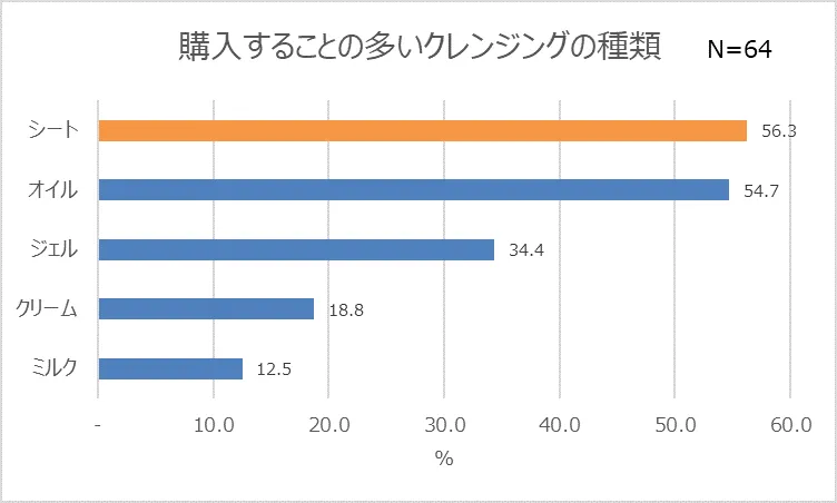 さらに、最も多く票が集まった「クレンジング」の種類について掘り下げて調査を行うと、「シート」タイプが人気の傾向にあることが分かりました(56.3%)。シートクレンジングは“時短”でメイクを落とすことができ、多忙な人にはおすすめのアイテムと言えそうです。