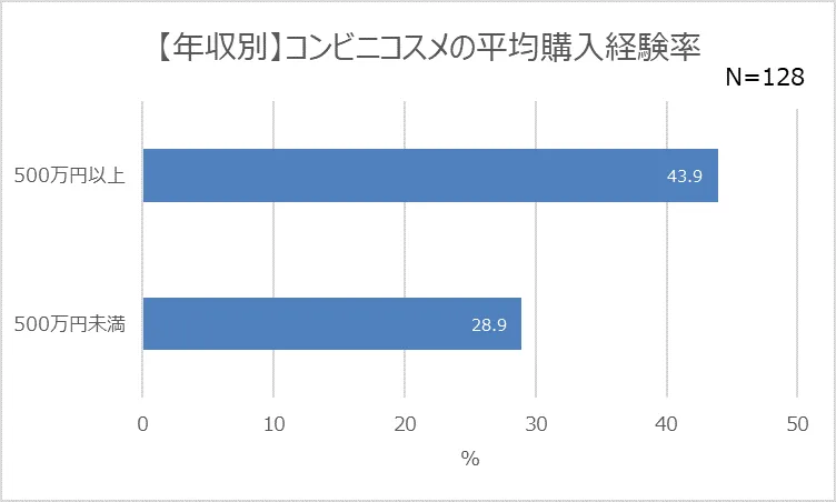 また、視点を変えて、コンビニコスメの購入経験者の仕事やビジネスにおける傾向についても調べてみました。一つの指標として“年収”を取り上げ、コンビニコスメの購入経験率を調査したところ、年収500万人以上の層の方が、年収500万円未満の層よりも15ポイント高い結果となりました。(43.9%)。
