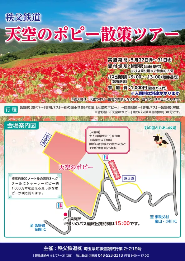 秩父鉄道株式会社(本社:埼玉県熊谷市、代表取締役社長:大谷 隆男)では、「天空のポピー」へ専用バスでご案内する「天空のポピー散策ツアー」を開催します。見頃を迎えるポピーの花々を満喫してはいかがでしょうか。詳細は、下記のとおりです。