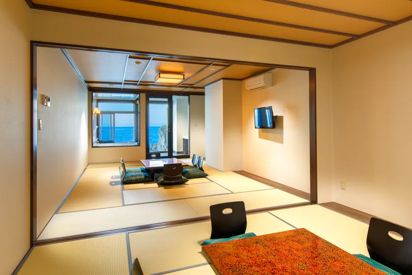 「海辺の展望露天風呂付客室」は奥間12畳、次間8畳、洋間15~22m2で定員10名様の特室タイプの和洋室です。3世代でのご旅行や、お子様を持つお母さま方のグループ旅行で、「全員で同じ部屋に宿泊したい、記憶に残る旅にしたい!」というご要望にしっかりとお応えいたします。