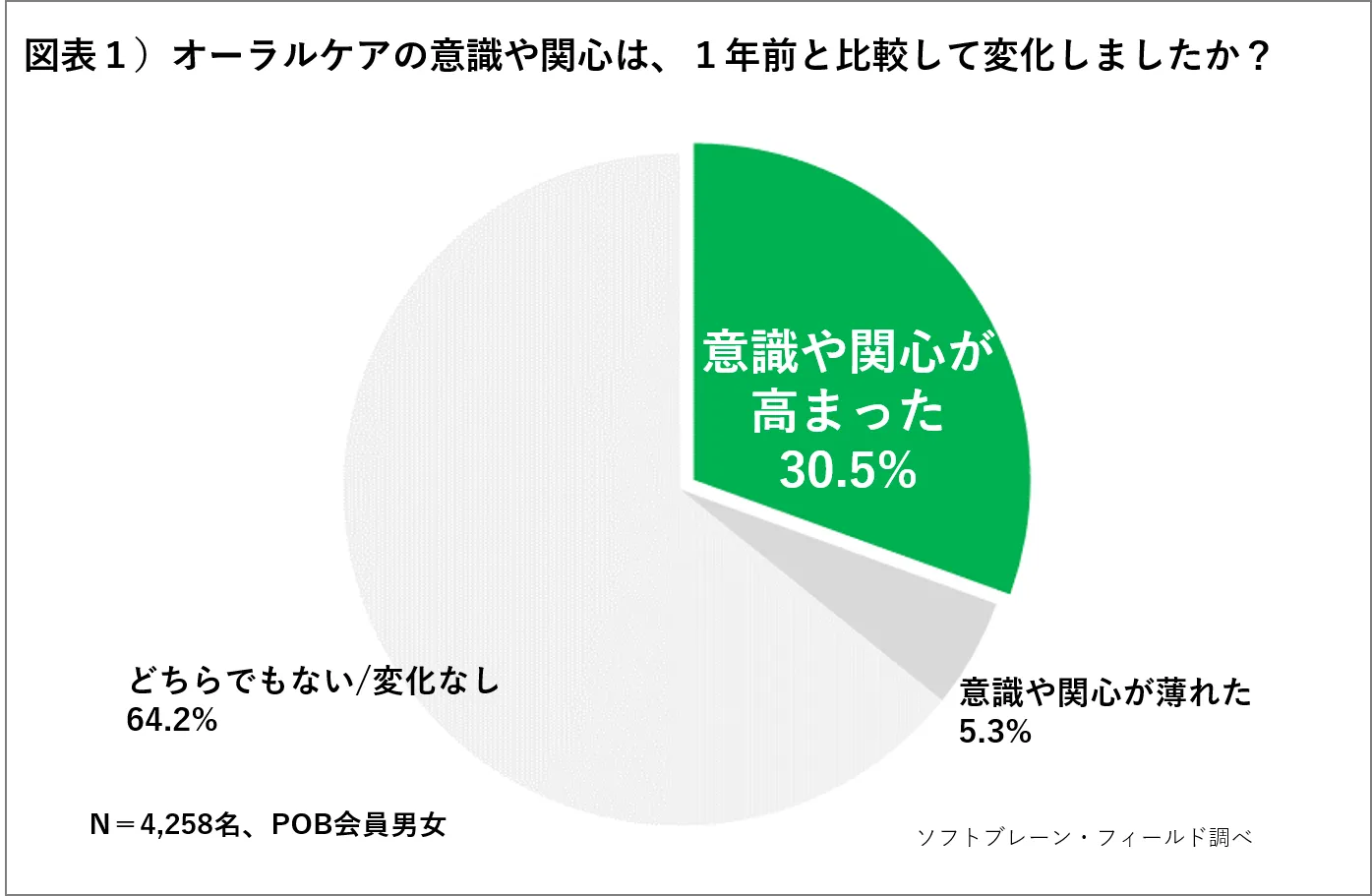 オーラルケアの意識や関心が1年前と比較して「高まった」と感じている人が、30.5%となり、3人に1人が高まったと感じていることがわかりました。