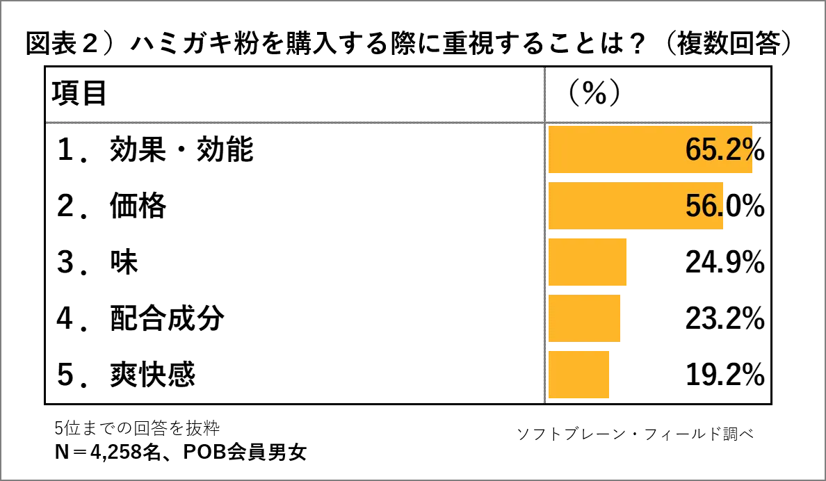 ・ハミガキ粉を購入する際に重視することは、「効果・効能」が65.2%で最多で、「価格」が56.0%、「味」が24.9%と続く。