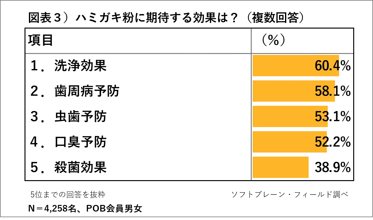 ・ハミガキ粉に期待する効果は、「洗浄効果」が60.4%が最多で、「歯周病予防」が58.1%、「虫歯予防」が53.1%、「口臭予防」52.2%と続く。