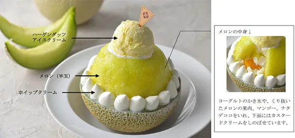 昨年から“夏のフルーツ×かき氷”をテーマに、夏季限定でかき氷スイーツを販売しており、今年はメロンを半分使って見た目も豪快にご用意いたします。メロンの中にはさっぱりとしていて夏にも食べやすいヨーグルトのかき氷を詰め込みました。さらに、ハーゲンダッツとマリアージュしてバニラアイスクリームをトッピング。ぜひこの機会にお楽しみください。