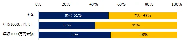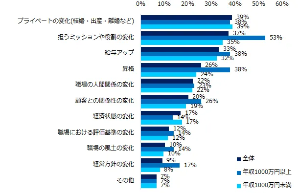 一方、「これまでに、働く理由を見失ったことはありますか?」と伺うと、半数が「ある」(51%)と回答しました。きっかけは、「職場の人間関係の変化」(55%)が最多。次いで「職場の風土の変化」(41%)、「経営方針の変化」(41%)が続きます。年収1000万円以上に比べ、年収1000万円未満のほうが働く理由を見失ったことのある経験が多いようです。