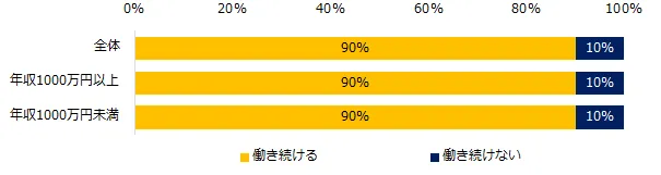 「ベーシックインカム(※)などにより最低限の所得が保障された場合、働き続けますか?」と伺ったところ、90%が「働き続ける」と回答しました。